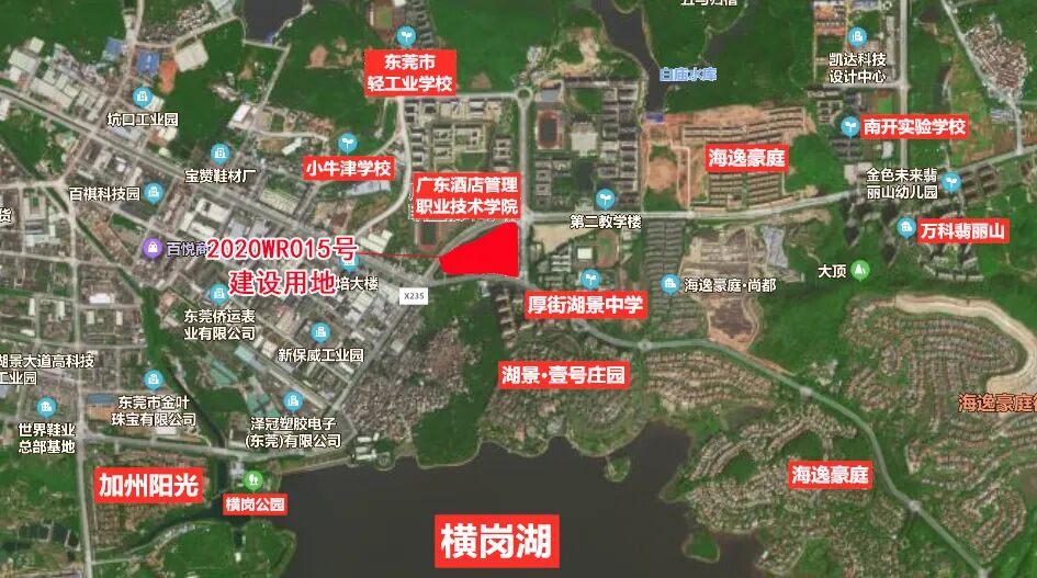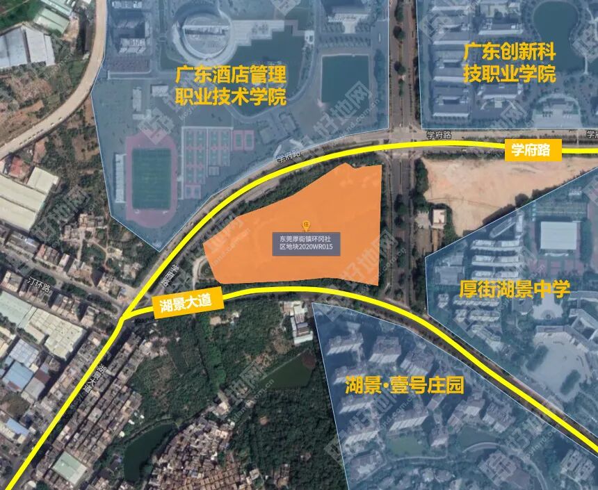 本宗地与湖景壹号庄园及海逸豪庭临近,周边教育资源非常丰富,有厚街湖景中学、东莞市伊顿海逸外国语学校、广东酒店管理职业技术学院、广东创新职业技术学院等多所学府,生态景观秀丽,非常适合开发为改善类型住宅楼盘,以生态景观及教育资源作为主打卖点。