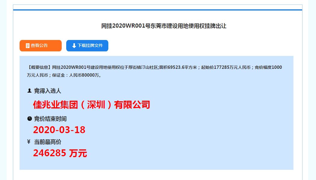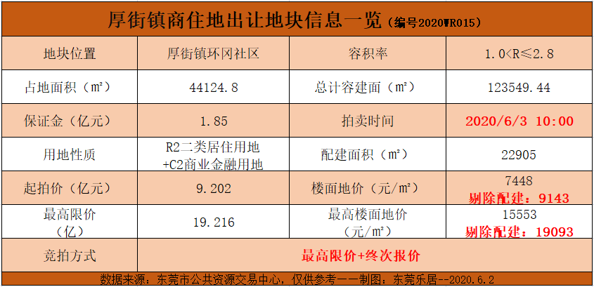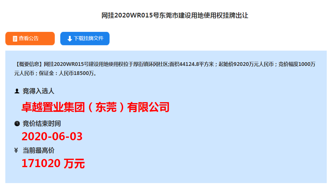 刚刚,历经14家房企、71轮激烈竞拍,厚街镇44124.8㎡商住地块最终被卓越置业集团(东莞)有限公司以总价17.1亿元,可售楼面地价16992元/㎡艰难斩获。刷新今年3月佳兆业以总价24.6亿,折合可售楼面价约12614元/㎡拿下的2020WG001地块,成为厚街单价最贵地块。