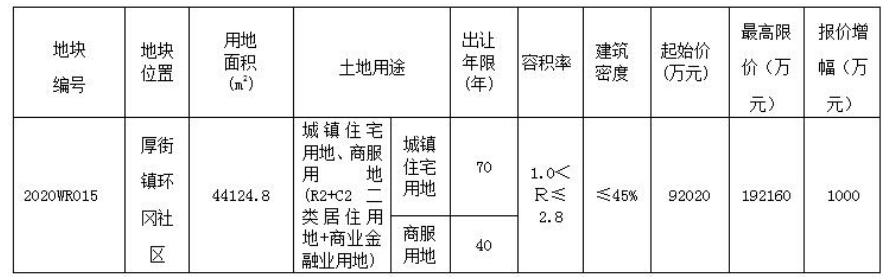 该地块占地面积44124.8㎡,容积率上限为2.8,总计容建面123549㎡,起始总价9.2亿元,起拍楼面地价7448元/㎡,最高楼面限价15553元/㎡。