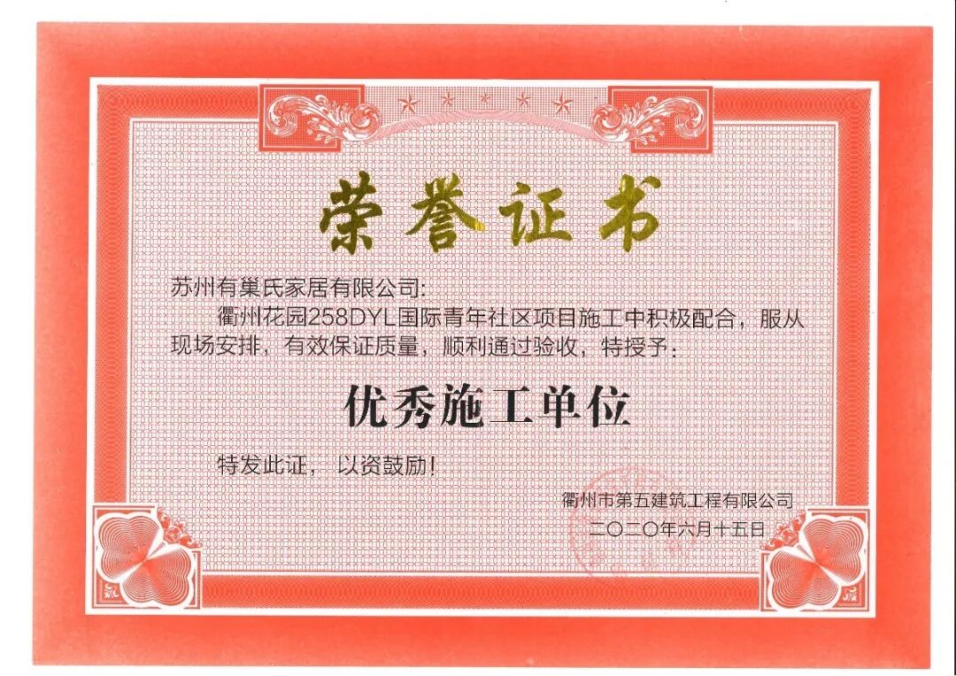 目前,衢州花园258DYL国际青年社区早已正式投入使用,总包衢州市第五建筑工程有限公司为表彰我司在项目施工交付、售后服务阶段表现出的高度配合,有效保证整个施工进度的如期进行,特为我司颁发“优秀施工单位”荣誉证书。
