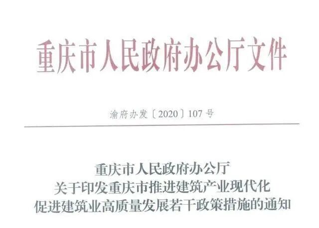 日前,重庆市推进建筑产业现代化促进建筑业高质量发展若干政策措施印发。文件指出,要扩大装配式建筑实施规模。全市政府投资或主导的建筑工程项目以及有条件的轨道交通、道路、桥梁、隧道项目全面采用装配式建筑或装配式建造方式。