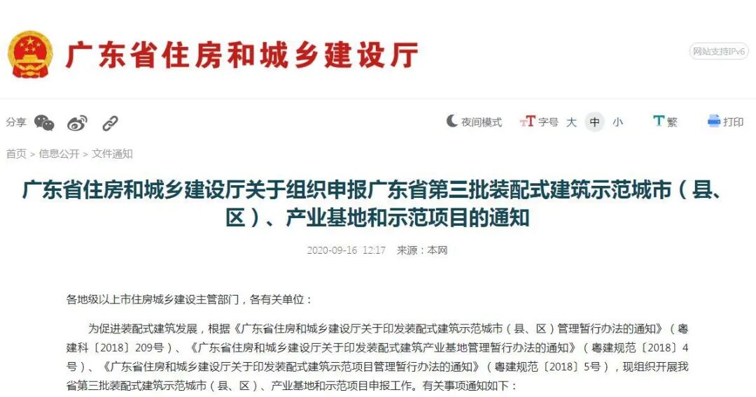 为促进装配式建筑发展,广东省住建厅组织开展广东省第三批装配式建筑示范城市(县、区)、产业基地和示范项目申报工作,申报时间截止日期为2020年10月20日。