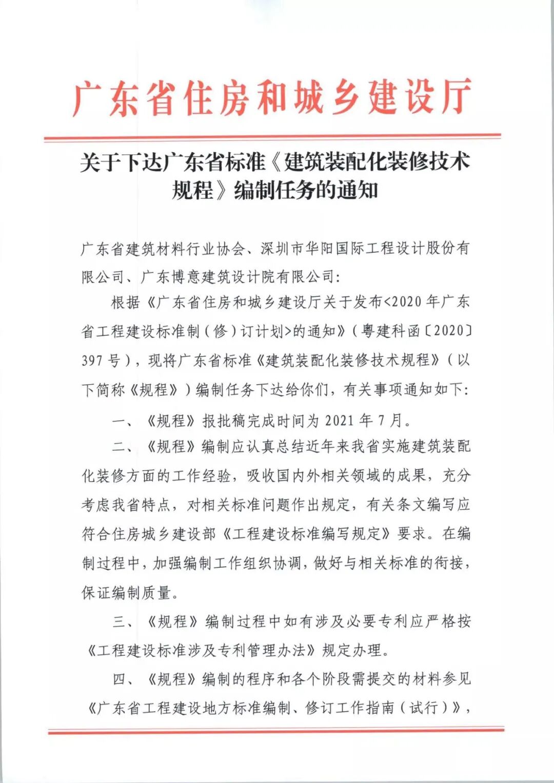9月1日,由广东省建筑材料行业协会装配式建筑分会牵头组织编制的广东省标准《建筑装配化装修技术规程》收到广东省住建厅下达的批准立项通知,意味着广东省装配化装修即将进入标准引领、技术驱动、规范前行和提速发展的新阶段。