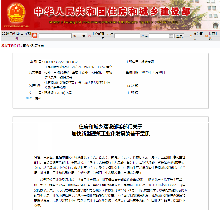 9月15日,住建部发布《住房和城乡建设部办公厅关于认定第二批装配式建筑范例城市和产业基地的通知》,佛山市等18个城市被认定为第二批装配式建筑范例城市,12个园区、包括6家广东企业在内的121家企业被认定为第二批装配式建筑产业基地。