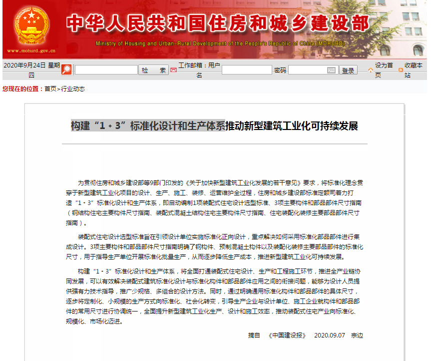 为贯彻住房和城乡建设部等9部门印发的 《关于加快新型建筑工业化发展的若干意见》要求,将标准化理念贯穿于新型建筑工业化项目的设计、生产、施工、装修、运营维护全过程,住房和城乡建设部标准定额司着力打造 “1﹢3”标准化设计和生产体系,即启动编制1项装配式住宅设计选型标准、3项主要构件和部品部件尺寸指南。