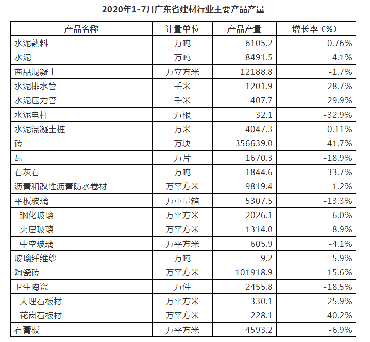 2020年1-7月,全省建材(未含建筑用五金)完成工业增加值760.7亿元,同比下降7.1%;工业销售产值3008.1亿元,下降6.1%;利润总额223.7亿元,下降3.5%。三项指标降幅分别比上半年收窄2.5、2.6和3.1个百分点。全省建材规模以上企业实现出口交货值225.4亿元,同比下降5.8%,降幅比上半年收窄3.6个百分点。