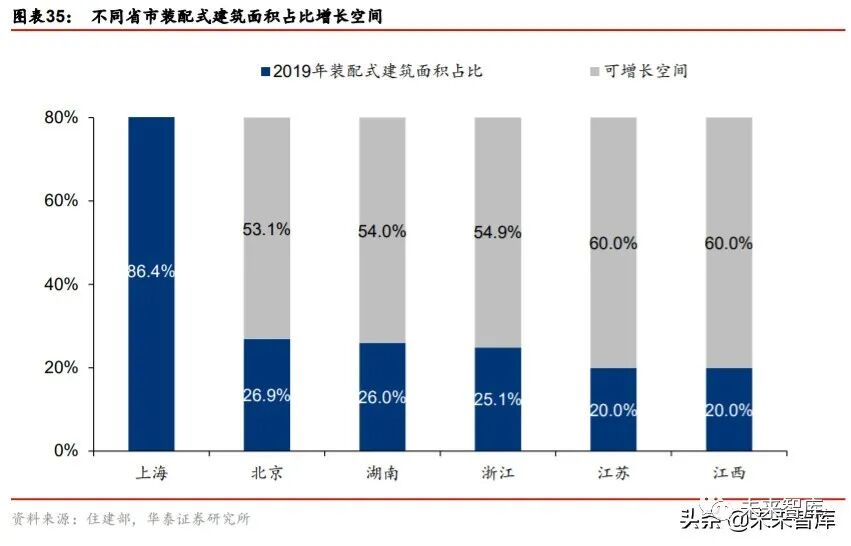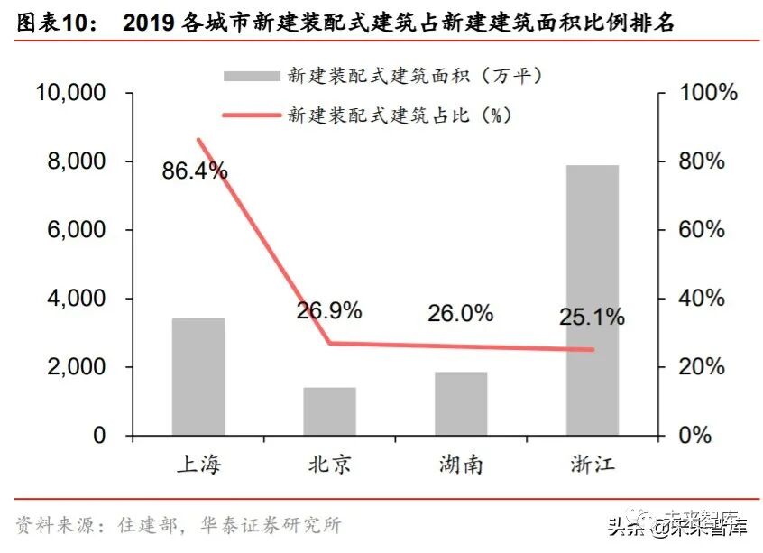 从新建建筑中装配式建筑面积占比来看,北京仍有较大的提升空间,而上海的提升空间比较有限。2019 年上海新建装配式建筑 3444 万 m2,占新建建筑比例为 86.4%;北京新建 装配式建筑 1413 万 m2,占比为 26.9%。最近的装配式政策中,海南省《关于加快推进装 配式建筑发展的通知》中要求到 2022 年底海南各市县商品住宅实施计划项目中,采用装 配式方式建造的比例不低于 80%。我们假设全国各省市最终的装配式建筑面积占比能达到 海南 80%的目标渗透率,则北京装配式建筑渗透率的提升空间为 53.1%,而上海则难再 有提升空间??悸堑礁鞔蟪鞘忻磕晷陆ńㄖ婊疚榷ǎ虼宋颐窃ぜ莆蠢幢本┑厍?件的需求量的增长空间依然较大,而上海地区的需求量则可能难以再有大幅增长。