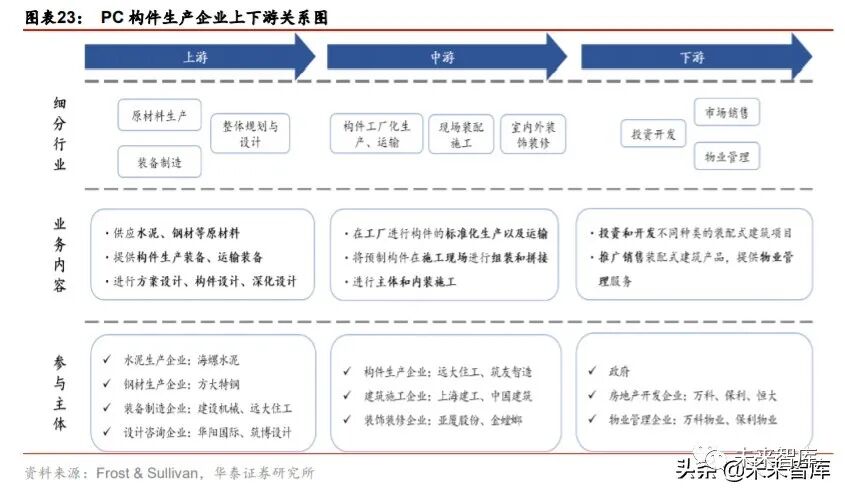 从产业链上下游来看,PC 构件产业链的上游主要是水泥、钢铁、木材等原材料供应商、 构件制造设备商以及建筑设计公司,中游是 PC 构件的制造商、现场装配施工的承包商和 装饰装修公司,不同制造商的产能布局、生产成本、管理能力等具有明显差异,下游则是 建筑项目的开发商和物业管理企业。16 年之后随着装配式建筑行业的快速发展,PC 构件 的价格一路水涨船高,且由于行业的进入门槛相对较低,构件制作工艺相对简单,看似一 门“简单赚钱”的生意,故产业链上下游的部分企业向 PC 构件生产制造进行布局。按照市场化程度,目前 PC 行业内公司主要可分为集团内产业配套公司和市场化的专业公 司。国内传统建筑行业的老牌龙头公司,比如中国建筑、上海建工,由于具有较强的设计、 融资、施工一体化的综合能力,因此在承接装配式建筑 EPC 项目业务领域具有明显的优 势,集团旗下所布局的 PC 构件制造厂主要为集团内部的项目供货,代表企业有中国建筑 旗下的中建科技。而市场化的专业公司大多是依托在设计、安装或构件生产等某一方面所 积累的优势,形成一定的技术或管理体系壁垒,依靠较高质量的产品和服务获得市场的认 可,从而不断拓展业务。部分市场化企业也会逐渐将业务向上、下游延伸,成为覆盖全产 业链、有能力承接 EPC 项目的集成式企业。