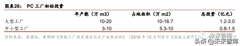 运输半径限制造成行业“跑马圈地”竞争加剧,龙头份额有望提升: PC 构件制造行业进入门槛较低,但是投资回收期较长,看似一门简单的生意但是需要经历较长的等待方可收获果实。从所需初始投资来看,根据詹耀裕,黄绸辉《预制工厂投资 建议与生产效率分析》(2018 年 12 月刊登于《混凝土世界》),通常投资建设单个年产能 3-10 万立方米的中小型工厂需 0.8-1.5 亿元,若厂房采用租用的方式,则初始投入更低。但是 PC 构件厂后续实现盈利并不容易,根据远大住工招股说明书中披露,其联营工厂一 般从设立到投产需要 1-3 年时间,到开始盈利还再需要 2 年时间,从工厂成立到收回投资 则需要总计 8 年左右时间。如果产能利用率不高,则需要 10 年甚至更长的时间才能收回 投资。