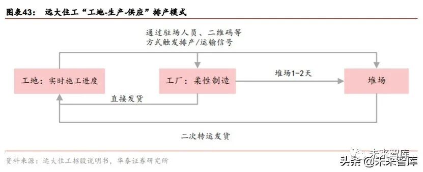 成本优势的来源之二:精细化管理。当产量达到较大规模后,如何更加高效地对采购、排 产、运输等各个环节进行管理是构件生产企业面临的问题。目前行业内多数工厂主要依靠 人工排产,由于建筑工地施工周期多变,从而导致组织效率较低,生产出的构件需要在堆 场放置较长时间,一般来说堆场的面积是工厂的 2-3 倍,对土地的占用较大。国企由于早 期获得划拨的土地成本较低,使用大面积堆场对构件成本影响不大,但是对于民营企业来 说,堆场面积过大会增加其土地成本。行业龙头远大住工通过多年的研发和数据沉淀开发 出智能制造管理系統 PC-CPS,生产计划严格按照工地的需求和施工进度来安排,“工地生产-供应”排产模式减少了人为管理的因素,生产的构件一般 1-2 天之内就会运至工地, 从而减少了堆场和二次转运费用,组织效率和周转率也显著提高。