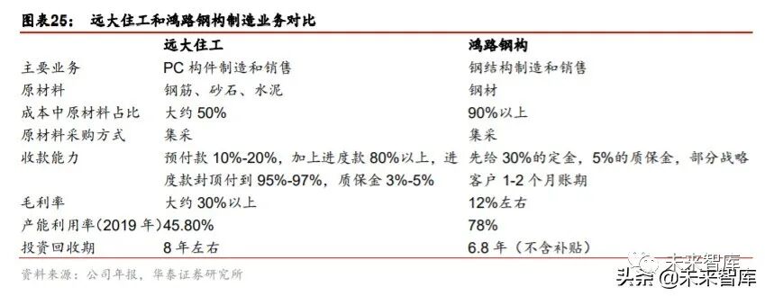 从原材料的成本构成来看,相较于钢结构制造企业来说,未来 PC 制造企业的降成本空间 更大。PC 构件制造的逻辑与钢结构制造有类似之处,二者商业模式都较传统的工程业务 更优,现金流获得能力更强,周转率更高,另外,生产规模较大的龙头公司可以向上游进 行集采,从而降低采购成本。不同的是,远大住工 PC 构件制造的成本中原材料占比大约 50%,而鸿路钢构制造业务成本中原材料占比超过 90%,我们认为原材料成本具有一定的 刚性,更多地受市场因素影响,而人工费用、制造费用等成本更易通过精细化管理、规模 化生产等方式降低,由于 PC 制造公司的原材料成本占比较低,我们认为其未来继续降成 本的空间更大,行业内的龙头公司更容易在后续的行业竞争中获取超额利润。