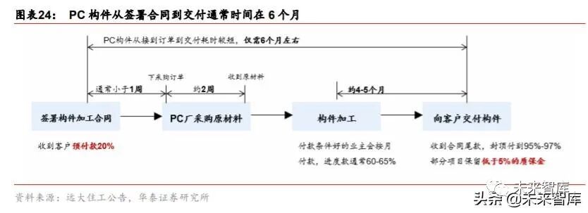 从商业模式来看,与钢结构行业类似,也可分为总承包和制造两种模式。成本管控和交付 能力是核心竞争力。在产业链的关系中,PC 构件的制造商是下游项目承包商的供应商, 相较于承包模式将大量的资金沉淀于项目之中,且项目的建设周期越长(通常 1-2 年), 企业的资金压力越大,通常采用按照项目进度进行确认收入的形式,制造商主要深耕于 PC 构件生产制造,通常的结算方式采用“预付款+进度款+质保金”的模式,通常 PC 构 件运输到项目地签收之后,即可确认收入,项目周期通常在 6 个月之内,对于资金的占用 较少。我们认为无论是何种商业模式的选择,核心竞争力均在于成本管控和交付能力。对 于 EPC 总承包商来说,如何在项目的全生命周期实现经济效益的最大化,节约投资资金, 如何向业务交付满意的成果是总承包商需要考虑的问题,对于制造商来说,由于其聚焦于 生产制造环节,其成本构成通常为“原材料+人工+模具+蒸养等”,成本的合理管控带来的 则是利润端的增厚,而如何能按时按点地提交所需的原材料构件以保证项目顺利的进行, 这也是制造商需要考虑的重点。