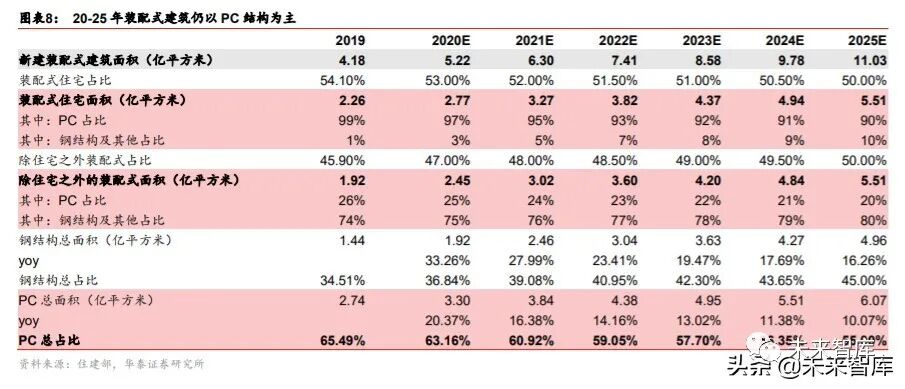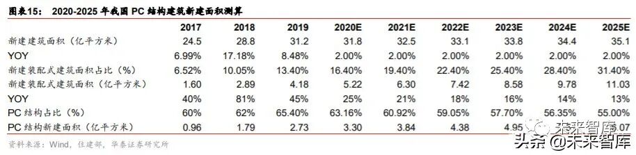 1)新建建筑面积:2019 年新建装配式建筑面积为 4.18 亿 m2,渗透率为 13.4%。由于住 建部并未直接披露每年的新建建筑面积和其统计口径,我们以披露的历年新建装配式建筑 面积和装配式建筑渗透率,可倒算出历年新建建筑面积。我们计算得出过去 5 年的新建建 筑面积的复合增速分别为 4.84%,考虑到 20 年后地产新开工面积增速趋缓,我们保守估 计 20-25 年新建建筑面积复合增速为 2%。2)装配式建筑面积占比:2017 年国务院办公厅发布的《关于促进建筑业持续健康发展的 意见》中要求,到 2025 年装配式建筑占新建建筑面积的比例要达到 30%。根据住建部数 据,2018/2019 年装配式建筑新开工面积占新建建筑面积比例为 10.05%/13.40%,我们假 定新建装配式建筑占比每年提升 3pct。3)PC 结构占比:根据住建部数据,2019 年我国新建装配式建筑中,PC 结构占比为 65.4%, 钢结构占比 30.4%。根据我们前文的测算,预计 2020-2025 年期间,新建装配式建筑中 PC 结构占比虽有一定的下降,但仍是 20-25 年装配式建筑领域发展的主流结构,预计 2025 年占比达到 55%。通过以上假设,我们可以测算出 20/25 年 PC 结构建筑新建面积 3.30/6.07 亿平米,20-25 年 CAGR+14.2%。