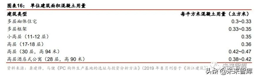 4)每平米混凝土体积系数:根据工程经验,多层砌体住宅每平方米混凝土用量为 0.3~0.35 立方,高层住宅(11-18 层)每平方米混凝土用量为 0.35~0.36 立方米。由于 PC 构件多 用于 100 米以下多、高层住宅,我们预计每平米混凝土体积系数为 0.35,由此计算出所 需混凝土体积。
