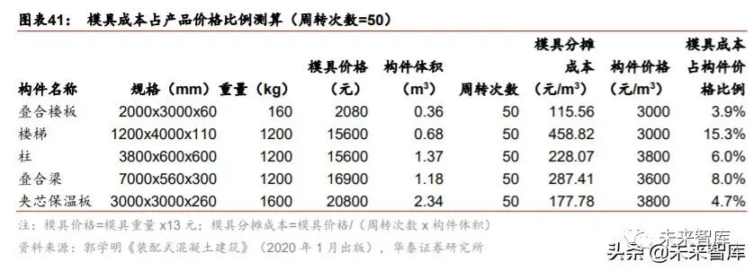 通过在设计环节提升构件的标准化程度,可以实现在生产环节的规模化和效率的提升,同时有助于提升模具的周转次数,降低模具成本。目前国内构件多为定制化、规格多,也就 造成了模具的定制化和非通用性。我们认为建筑工业化的前提是标准化,在设计环节尽量 提升构件的标准化程度,从而实现的模具的通用化。一般而言,最常见的钢模具最高周转 次数可达 200 次以上,但是行业内许多小公司只能做到周转几十次,导致模具成本偏高。根据郭学明《装配式混凝土建筑》(2020 年 1 月出版),当周转次数为 50 次时,大部分构 件的模具费占构件价格比例超过 4%,而楼梯的模具费占其价格比例高达 15.3%。当周转次 数提升时,单方构件的模具成本逐渐降低,当周转次数从 50 次提升至 200 次,单方构件 的模具成本从 326 元降低至 82 元。