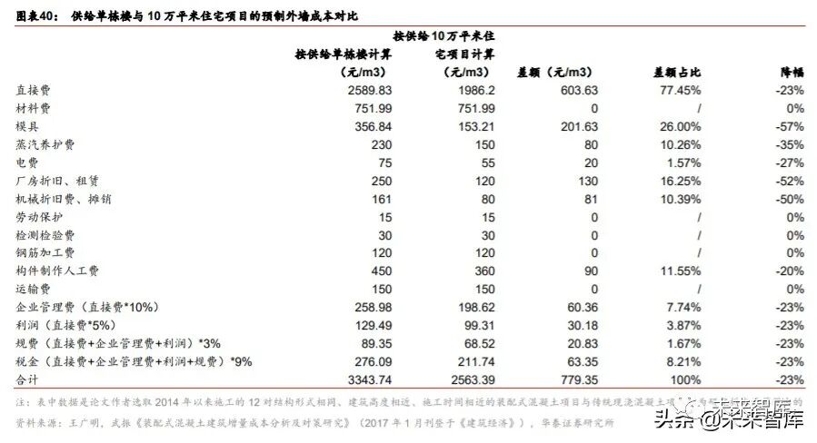 成本优势的来源之一:实现规模效应。规模效应可摊薄折旧摊销费用,目前行业内大多数 PC 构件生产企业规模和产量较小,前期投入的土地、厂房和购买的设备机器、模具等无 法得到充分利用,导致折旧摊销费用较高。我们比较当预制构件的产量达到一定规模后的 单方成本变化,根据王广明,武振《装配式混凝土建筑增量成本分析及对策研究》(2017 年 1 月刊登于《建筑经济》)中的案例研究,预制外墙在分别供给单栋楼和供给 10 万平米 住宅项目时,后者 PC 构件的直接费用大幅下降 23%。一方面,生产规模的扩大使得工厂 单位固定成本下降,在该案例中,厂房折旧、租赁费同比下降 52%,机械折旧费、摊销同 比下降 50%,模具费同比下降 57%,蒸汽养护费同比下降 35%。另一方面,规?;?可以降低单方人工成本,行业内诸如远大住工的市场化公司,采用计件方式给生产人员核 算工资,来提升其生产积极性,当产量增加时,生产人员的工作时间和产出也增加,单方 人工成本也相应被摊薄。规模效应还可以降低企业的原材料采购成本。PC 工厂采购的原材料主要是钢筋、水泥、 砂石等,当产量达到一定规模时,企业可向上游进行集采,从而获取更高的议价权,在降 低采购成本的同时,另外也可获得一定的产业链话语权。