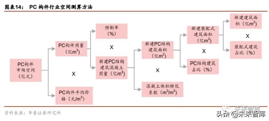 5)预制率:预制率为单体建筑结构构件采用预制混凝土构件的混凝土用量占全部混凝土 用量的体积比。由于我国装配式建筑的相关政策及行业标准仍在不断完善过程中,目前对 于 PC 结构建筑的最低预制率没有统一要求,因此不同地区装配式建筑的预制率相差较大。装配式建筑发展全国领先的上海要求 2016 年 4 月 1 日以后完成报建或项目信息报送的项 目,单体预制率不低于 40%,而 2015 年 1 月 1 日之前完成报建的项目,单体预制率不低 于 25%。我们保守估计 2020 年全国装配式混凝土建筑的平均预制率达到上海 2015 年的 预制率 25%的标准,并且在 2025 年达到目前上海要求的 40%的标准,平均每年预制率增 加 3pct。6)PC 构件单价:住建部数据表明,2017-2019 年新建装配式建筑中重点推进地区(京津 冀、长三角、珠三角)占比分别为 47.19%/46.82%/47.17%,各地区装配式发展不平衡导 致 PC 构件的价格存在地区化差异,以预制叠合楼板为例,19 年上海区域的售价大致是 3555 元/立方米,沈阳区域的售价大致是 2932 元/立方米,参考两者均值价格,我们假设 19 年 PC 构件的价格大致为 3200 元/立方米。根据我们草根调研,由于上海等区域目前 PC 构件供大于求,构件价格已出现下降趋势??悸堑缴杓扑接呕凸婺PвΥ吹某?本下降,以及未来几年可能出现竞争加剧带来的价格下行,我们保守预计 20-22 年/23-25 年 PC 构件单价分别每年下降 3%/2%。根据以上假设,我们预计 20/25 年 PC 构件市场空间为 895/2335 亿元,20-25 年 CAGR 为+22.4%,其中 20-22 年 CAGR+26.0%,23-25 年 CAGR+18.9%,20-25 年 PC 构件行 业市场空间仍处于快速扩充的状态。