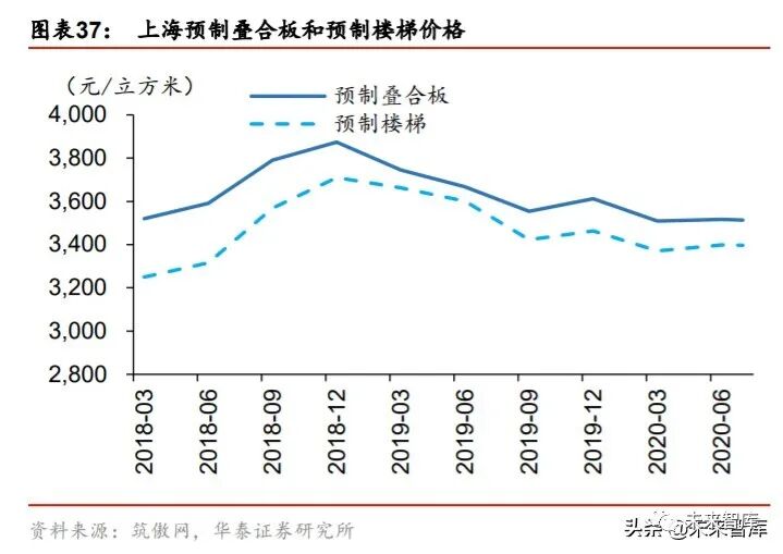 不同区域供需结构不同,造成构件价格走势分化,区域价格下降反映产能过剩。由于北京 地区产能增加更加温和,供需情况较好,且受最近两年原材料价格上涨影响,北京预制叠 合板和楼梯价格自 2018 年以来基本保持稳步上升趋势。2020 年 6 月预制叠合板/预制楼 梯单方价格分别高达 3920/3730 元(含税),而上海由于产能增加更加迅速,产能供给较 充足,因此同样的产品平均价格比北京同期的价格便宜 100-300 元左右,且在 2018 年 12 月价格达到顶峰后便开始逐渐震荡下滑。我们认为目前上海的构件市场或已较为成熟,加 剧的竞争使得价格承压,行业盈利空间下滑,部分盈利状况不佳的中小企业或将逐渐退出 该市场,当地龙头企业的市场份额或将逐渐增加。而北京由于还有较大的需求增长空间, 我们认为当地构件市场未来几年或仍将处于成长期,但是仍需关注供给增加过快导致产能 过剩的风险。