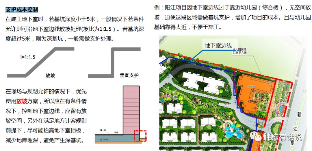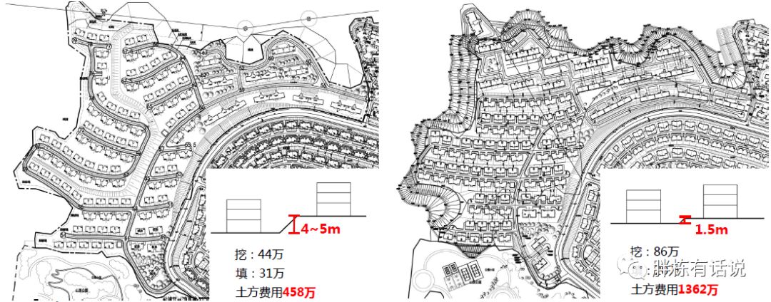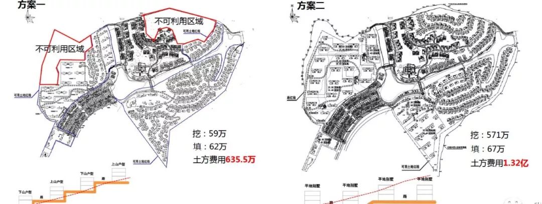 在投资阶段,对于山地项目,可通过竖向分析及边坡处理,考虑将不可利用的陡坡用地划出用地红线,以控制土方成本。