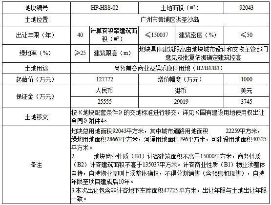 黄埔区HP-HSS-02地块出让面积92043㎡(城市道路用地面积22259㎡,绿地用地面积28663㎡,河涌用地面积796㎡,可建设用地面积40325㎡),计容建筑面积≤150037㎡,起始价127772万元,竞买保证金25555万元,建筑密度≤50%,绿地率≥25%。