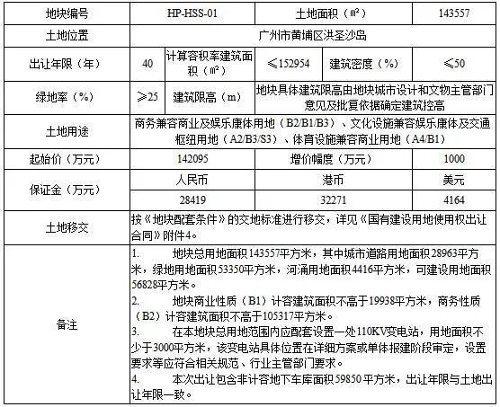 黄埔区HP-HSS-01地块出让面积143557㎡(城市道路用地面积28963㎡,绿地用地面积53350㎡,河涌用地面积4416㎡,可建设用地面积56828㎡),计容建筑面积≤152954㎡,起始价142095万元,竞买保证金28419万元,建筑密度≤50%,绿地率≥25%。