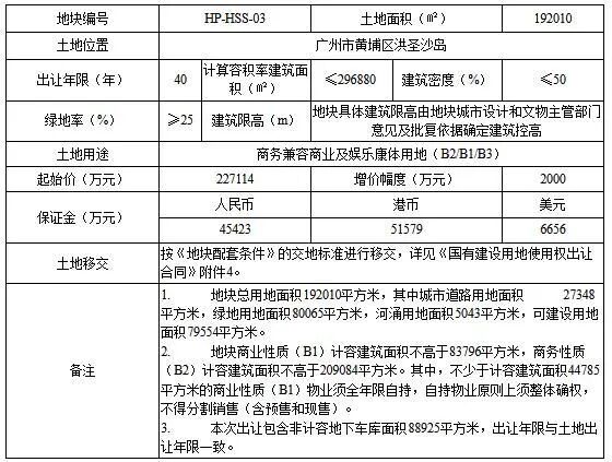 黄埔区HP-HSS-03地块出让面积192010㎡(城市道路用地面积27348㎡,绿地用地面积80065㎡,河涌用地面积5043㎡,可建设用地面积79554㎡),计容建筑面积≤296880 ㎡,起始价227114,竞买保证金45423,建筑密度≤50%,绿地率≥25%。